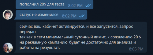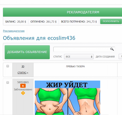 Решено было создать новый тизер и настроить кампанию. После модерации, я написал в службу поддержки, мол готов пополнять минималку пока что, она там 20$, и поинтересовался, запуститься ли в открутку мой тизер после этого. Указал так же айди объявления и сказал, что у него странный статус: «Заблокировано»….