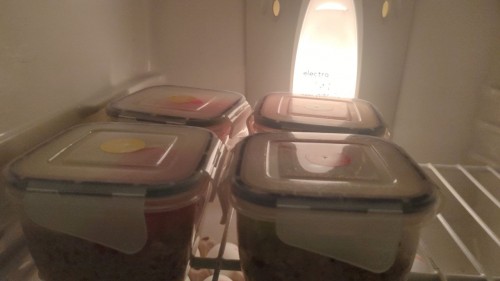 Сегодня проснулся и приготовил гречку, сварил яйца и порезал салат с помидорами и огурцами. Потом освободил 5 пластиковых тар небольшого размера. Это не простая посуда, именно в них я в 2021 году ложил еду и ставил в холодильник, ел каждые 3 часа и худел на 1 килограмм каждый день. Тоже самое начал делать сегодня. Разложил еду по посудам и поставил в холодильник.